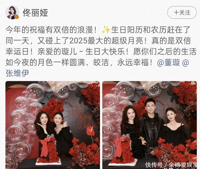 昨天佟丽娅特意发了微博,祝她亲爱的璇儿生日快乐,还说这日子特别有意义,农历和阳历凑到一块儿,晚上还有圆圆的月亮作陪,简直是双倍幸运呀!最后还不忘祝福这对新人永远幸福,字里行间全是闺蜜间的深厚情谊。佟丽娅还晒了董璇的生日美照,现场布置也太浪漫了吧,到处都是黑色和艳红色的玫瑰,连蛋糕都是花朵做的,看得出来张维伊这次是真的用心了。董璇虽然已经当妈妈了,但身材和皮肤保养得也太好了,跟佟丽娅站在一起,活脱脱两个刚入社会的小姑娘。她穿了件黑色长款毛衣,佟丽娅则是同色系的一字肩衬衫,两人靠在一起笑得特别甜。不过三人合照的时候,张维伊看着倒有点拘谨,身体绷得紧紧的,脸上的笑容好像是硬挤出来的,估计还是不太适应镜头吧。但董璇就不一样了,全程笑容满面,还亲昵地挽着老公的胳膊,那状态好得让人都有点意外。